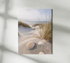 Conchiglie su St🏖️ Conchiglie nella sabbia - pace, mare e leggerezza. Questo suggestivo motivo da spiaggia mostra delicate conchiglie, erba delle dune e dune di sabbia in tenui tonalità beige e blu. Ideale come poster, tela o murale per la casa. Perfetto per gli amanti delle coste, del Mare del Nord e del Mar Baltico. Questo paesaggio marino conferisce un'atmosfera naturale da spiaggia, una sensazione estiva e una decorazione marittima al vostro soggiorno, alla vostra camera da letto o al vostro bagno. 🌊✨ Bordo tra dune e prati