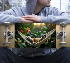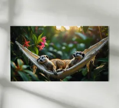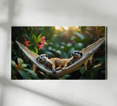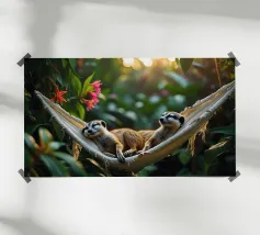 Due suricati giacciono fianco a fianco su un'amaca, con la testa leggermente sollevata come solo loro sanno fare. Sembra che stiano discutendo su chi si alza per primo, ma nessuno ha fretta. Perfetto per la camera di un adolescente o come poster da giardino con un sorriso.