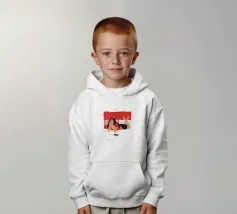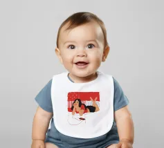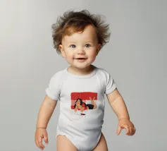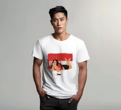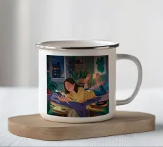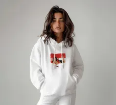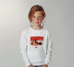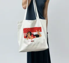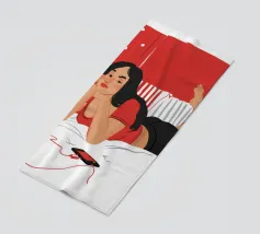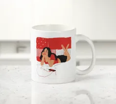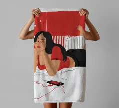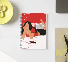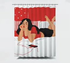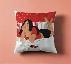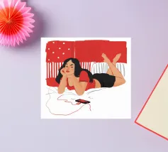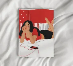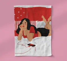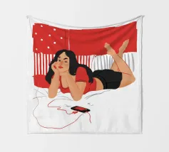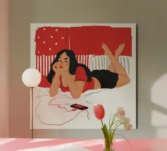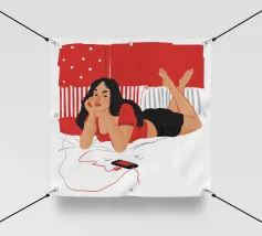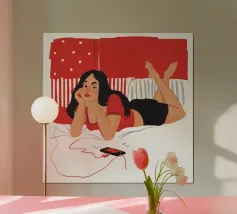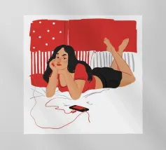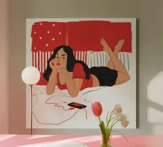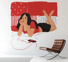 Una figura giace su un letto rosso, ascoltando musica in cuffia, con un'espressione rilassata e contemplativa, creando una scena di svago intima e moderna.