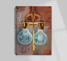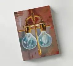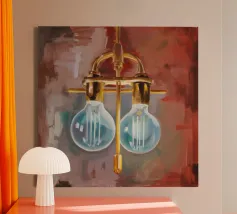 Un'applique d'epoca a doppia lampadina si illumina con calore su uno sfondo rossastro e strutturato.
