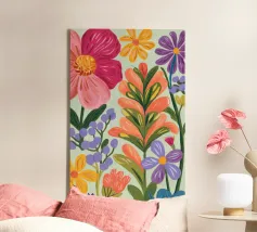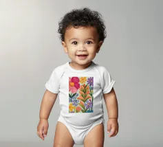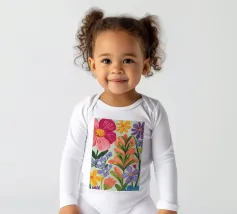 Questa immagine presenta il testo "STAY GROOVY" in un carattere retrò circondato da fiori e piante colorate. Il design complessivo ha un'atmosfera anni '70.