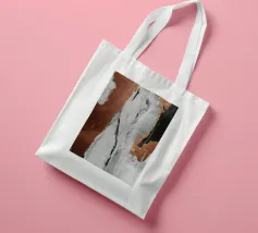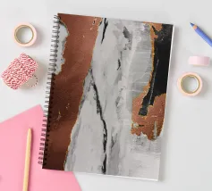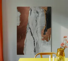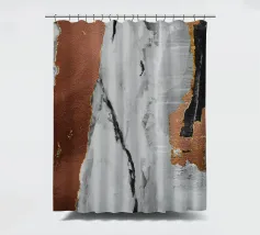 I toni metallici e terrosi sono accostati a motivi astratti simili al marmo, creando un contrasto visivo di grande effetto. Le calde tonalità del rame si fondono perfettamente con gli elementi freddi grigi e neri, offrendo un senso di profondità e consistenza.