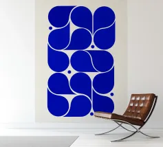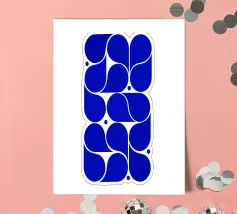 Aggiungete un tocco di raffinatezza rétro al vostro spazio con questa stampa geometrica astratta moderna di metà secolo. Le audaci forme fluide blu su uno sfondo crema creano un design sorprendente e minimalista. Questa stampa è perfetta per gli amanti dell'arte astratta e dell'estetica moderna di metà secolo. Progettato da showmemars