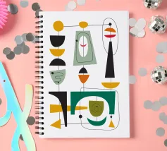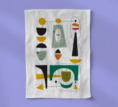 Retro Glide 3 - una vibrante opera d'arte moderna di metà secolo caratterizzata da audaci forme geometriche in diverse tonalità di verde, giallo, arancione e nero. Parte di una serie esclusiva, questo disegno astratto cattura il ritmo nostalgico degli anni '50 e '60 con un tocco fresco e minimalista.