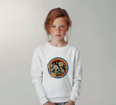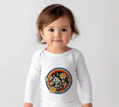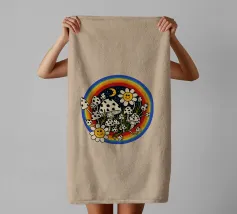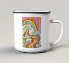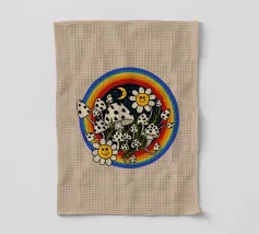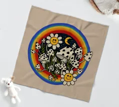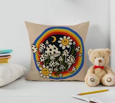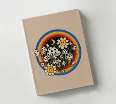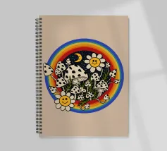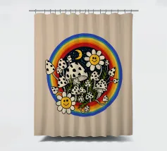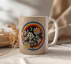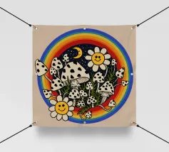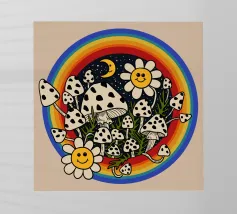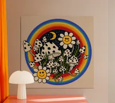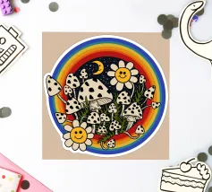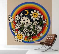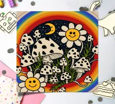 Midnight Happy Meadow cattura una scena stravagante di fiori bianchi di margherita con volti sorridenti, sullo sfondo di un cielo scuro e ricco di stelle e della Luna. Le vibranti tonalità dell'arcobaleno creano un magico prato notturno che irradia gioia e fascino retrò. Funghi magici in bianco e nero che danno il benvenuto alla stagione autunnale.