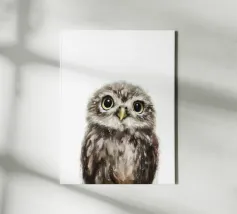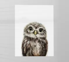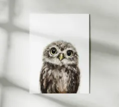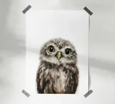 Questa delicata e dolce illustrazione ad acquerello mostra un piccolo gufo. Con i suoi grandi occhi curiosi e i dettagli delle piume, sembra carino e giocoso allo stesso tempo. Il design minimalista su sfondo bianco conferisce al motivo un'atmosfera calma e naturale, perfetta per gli amanti dell'arte animale e della natura.