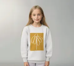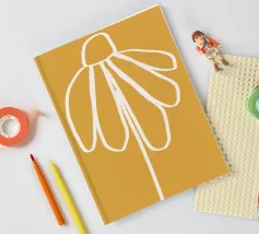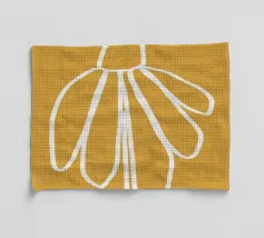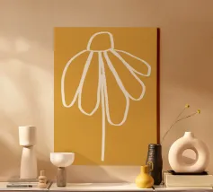 Illustrazione minimalista di margherite line-art su sfondo giallo.