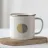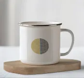 Opera d'arte geometrica minimalista con linee nere e una forma rotonda in giallo ocra con texture e sfondo beige.
