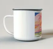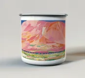 Una catena montuosa stilizzata è dipinta in sognanti tonalità pastello di rosa, arancione e blu; le sue forme morbide e fluide creano un paesaggio etereo e sereno che sembra un miraggio.