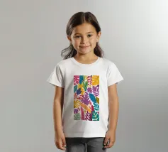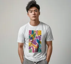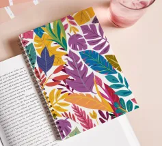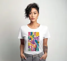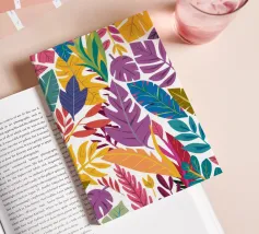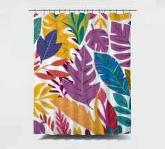 Un vivace motivo di foglie tropicali stilizzate in un mix di toni autunnali e gioiello come il viola, l'arancione, il giallo, l'alzavola e il marrone, che creano un'estetica della giungla ricca, dinamica e non convenzionale.