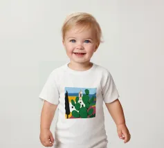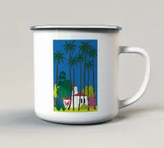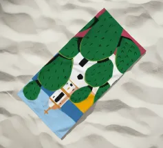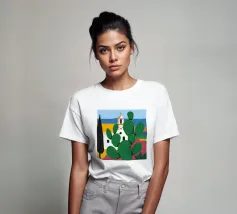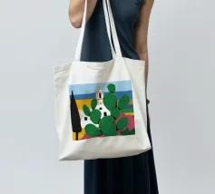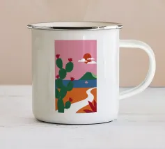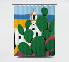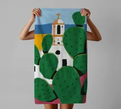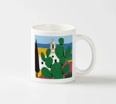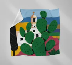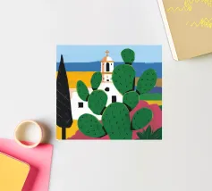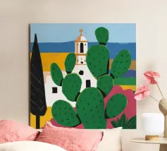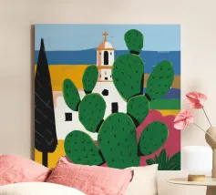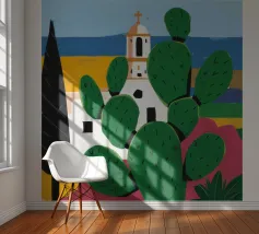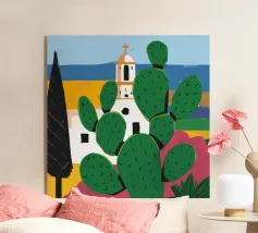 Un'illustrazione di cactus di fico d'India in primo piano con una classica chiesa bianca in stile missione sullo sfondo sotto un cielo blu. La scena cattura la bellezza serena e iconica di un paesaggio desertico.