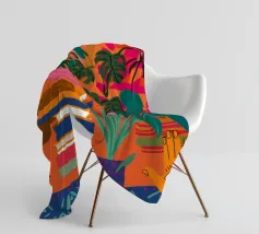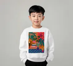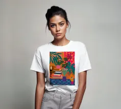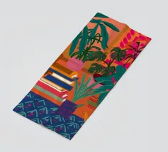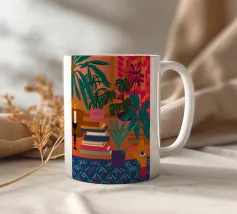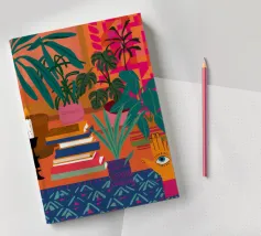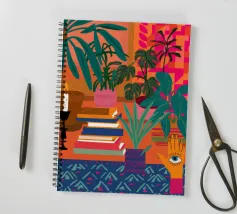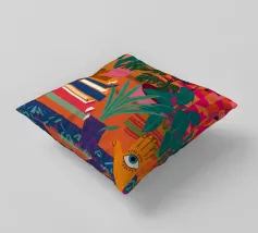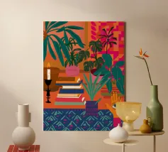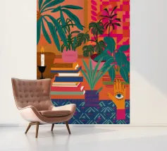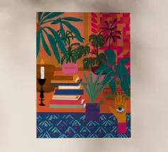 Una scena d'interni lunatica con piante lussureggianti, una candela accesa e un motivo di occhi su una superficie a fantasia, che crea un senso di misticismo notturno e di intrigo artistico.
