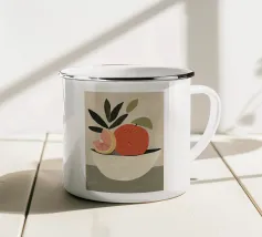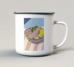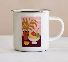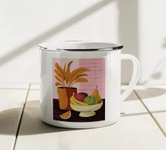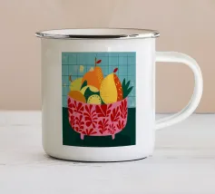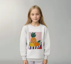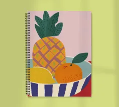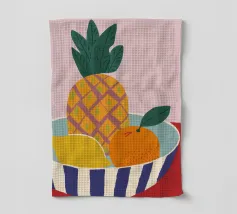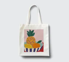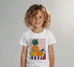Un ananas, un'arancia e altri frutti si trovano in una semplice ciotola bianca, con un audace sfondo rosa e blu che crea una vivace natura morta di ispirazione tropicale.