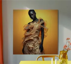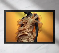 Un'immagine mozzafiato di una modella con uno splendido abito liquido su uno sfondo caldo e dorato, caratterizzato da motivi intricati e strati delicati, con un'estetica surreale e di alta moda che ricorda gli stili di Tim Walker e David LaChapelle.