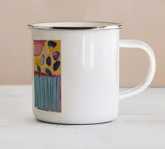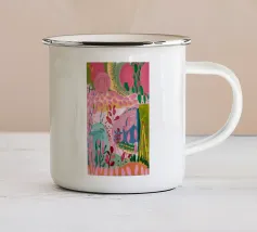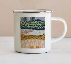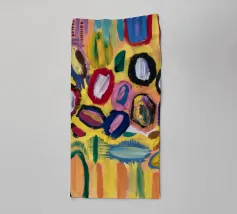 File di forme a U e punti ripetuti nei colori giallo, arancione, blu e verde della terra evocano la sensazione di un boschetto o di un campo disegnato in questa intricata opera astratta.