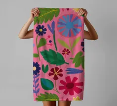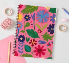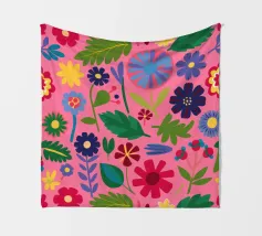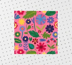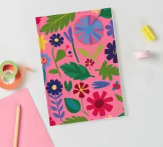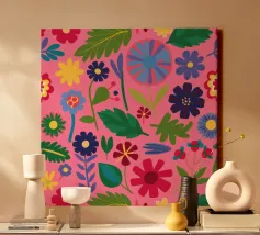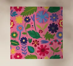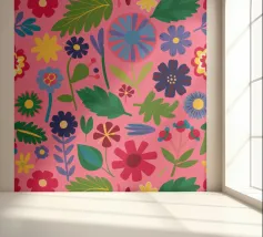 Un fitto disegno senza cuciture di fiori stilizzati di arte popolare in una tavolozza di colori vivaci e gioiosi di rosa, blu e arancione. Il disegno è vibrante e allegro.