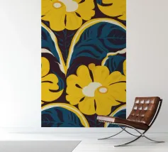 Un motivo audace e lussuoso di grandi fiori stilizzati di colore giallo oro su uno sfondo blu scuro. L'elevato contrasto e le forme eleganti creano un disegno floreale sofisticato e senza tempo.