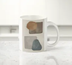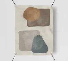 Arte digitale astratta e moderna che presenta linee, forme organiche e geometriche con texture in morbide tonalità terrose di marrone, blu e beige.