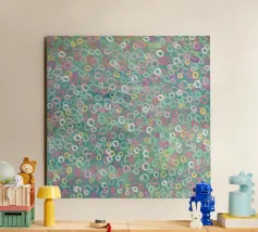 Dipinto astratto che presenta una moltitudine di anelli sovrapposti e dipinti liberamente in una varietà di colori pastello su uno sfondo verde mare strutturato. Gli anelli sono resi nelle tonalità del rosa, del giallo, del bianco e del verde con accenni di arancione e rosso, creando una composizione giocosa e stravagante che ricorda le bolle o le strutture cellulari al microscopio. L'effetto complessivo è di movimento e morbidezza, con i singoli elementi che si fondono insieme per formare un disegno intricato ma armonioso.