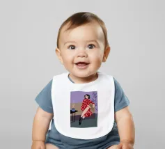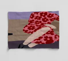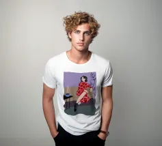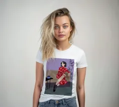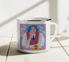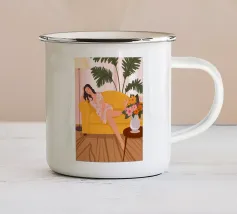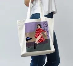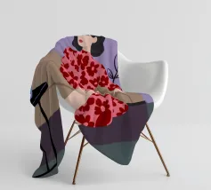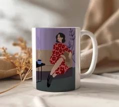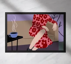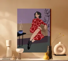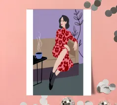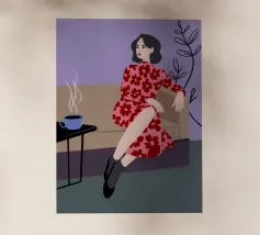 Una donna con un vestito rosso a fiori è seduta su una sedia con le gambe incrociate. Sul tavolino accanto a lei c'è una tazza di caffè fumante e lo sfondo è viola con una pianta.