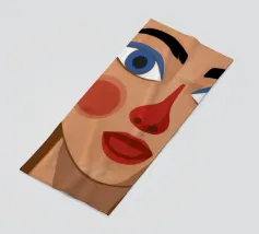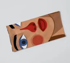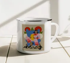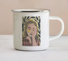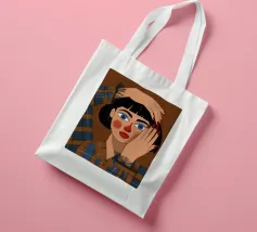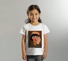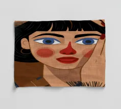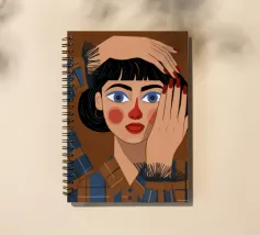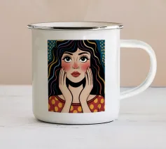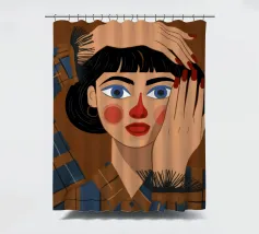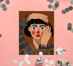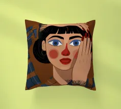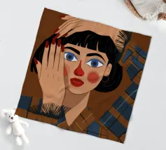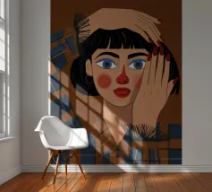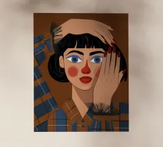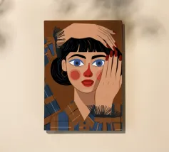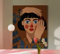 Questo dipinto mostra una persona con le mani sulla testa, circondata da un motivo a quadri e da elementi floreali. Lo sfondo è marrone e la posa suggerisce un momento di introspezione e di calma.