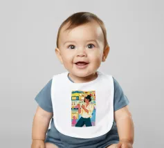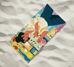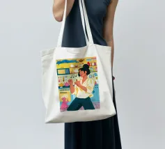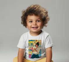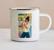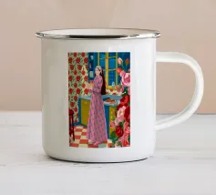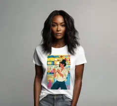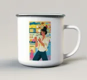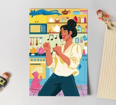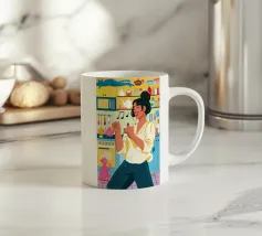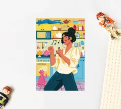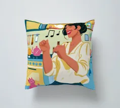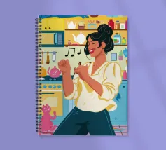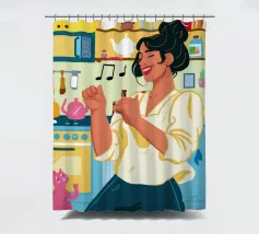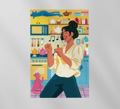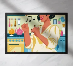 Un'illustrazione vibrante e gioiosa di una donna con le cuffie, che canta con la musica mentre tiene in mano una tazza. La scena è piena di vita e cattura un momento di pura felicità ed espressione personale.