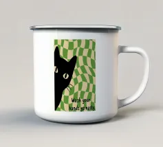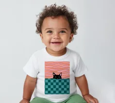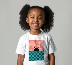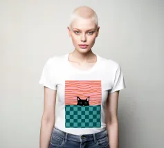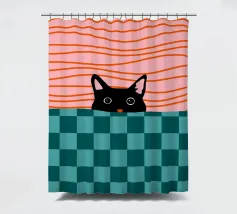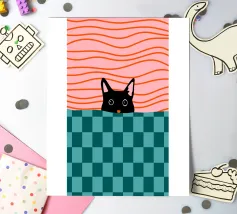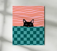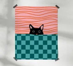 Un curioso gatto nero sbircia sopra un'accogliente coperta a scacchi, con i suoi occhi spalancati pieni di malizia. Lo sfondo ondulato rosa e arancione aggiunge un tocco giocoso e moderno. Perfetto per gli amanti dei gatti che amano un mix di minimalismo e design audace!