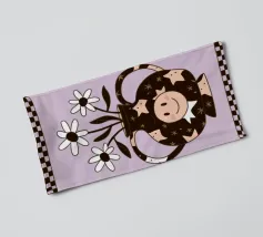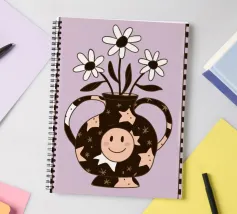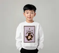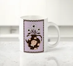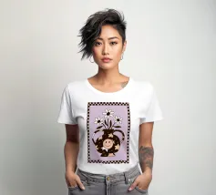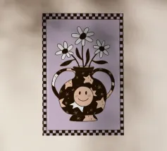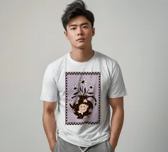 Illustrazione stravagante di una scimmia seduta sulla testa di una donna che tiene in mano un vaso di fiori. La scena è una rappresentazione giocosa, surreale e affascinante di un momento caotico e divertente.