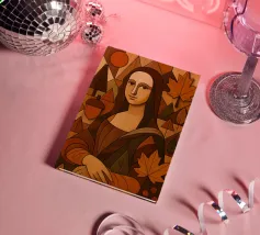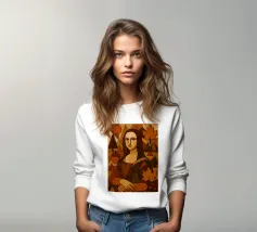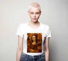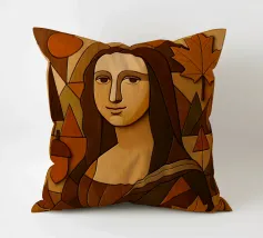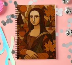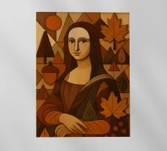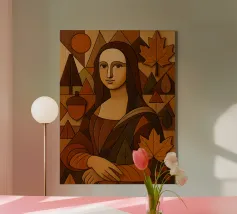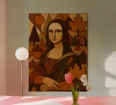 La Gioconda in legno intagliato ad effetto artistico. (Non si tratta di legno vero). Ispirato all'autunno con vari tipi di venature del legno, come mogano, quercia, betulla e acero, per scolpire la forma della Monna Lisa con l'uso di linee e curve nere per darle un aspetto più audace e moderno, ma allo stesso tempo caldo e accogliente.