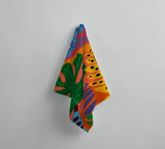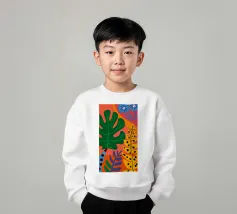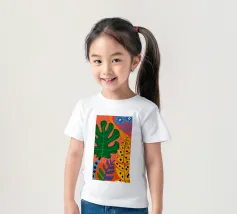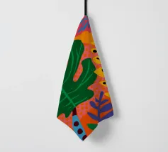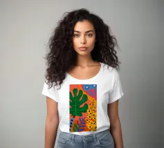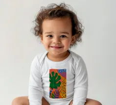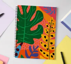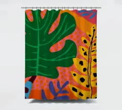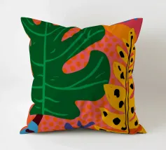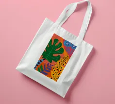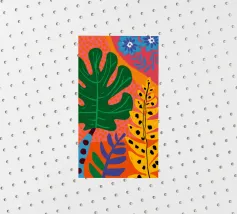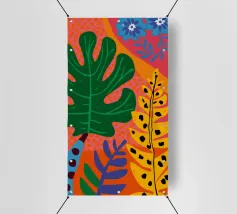 Una vibrante natura morta di una foglia di monstera in un vaso, su uno sfondo a strisce verticali arancioni e blu. La composizione è una celebrazione audace, moderna e grafica del fogliame e dei colori tropicali.