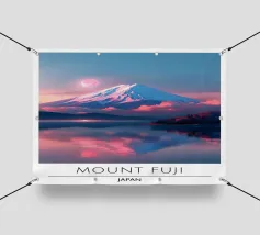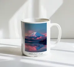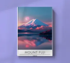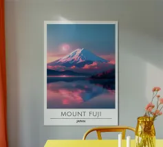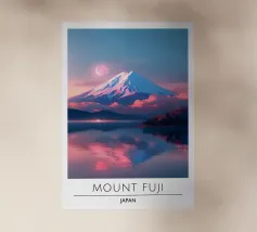 Portate l'iconica serenità del Giappone sulle vostre pareti con questa stampa digitale mozzafiato del Monte Fuji. L'opera d'arte cattura il maestoso vulcano innevato e il suo perfetto riflesso nel tranquillo lago sottostante. La scena è illuminata da un cielo crepuscolare rosa e blu e da una grande luna rosa, creando un'atmosfera eterea e serena. Questo poster di viaggio di qualità superiore cattura magnificamente la maestosità del più famoso punto di riferimento naturale del Giappone. Fornito come file digitale ad alta risoluzione (7000x5000 pixel, 300 dpi), garantisce una stampa nitida e di qualità museale.