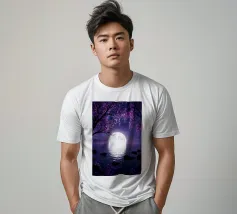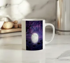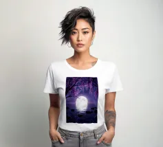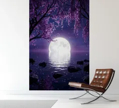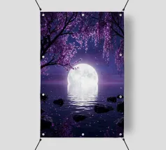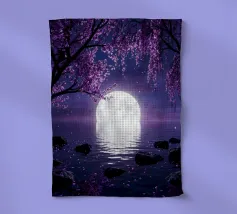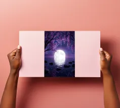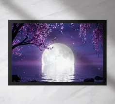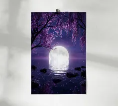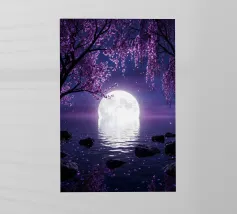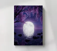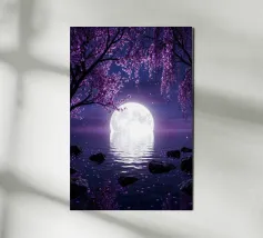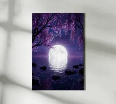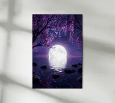 Moonlit Sakura è una serena opera d'arte di fantasia con rami di ciliegio in fiore che scendono a cascata su un lago tranquillo sotto una radiosa luna piena. I toni tenui del viola e del porpora riempiono il cielo notturno mentre i delicati petali scivolano dolcemente sull'acqua, creando un'atmosfera pacifica e onirica. Il riflesso della luna brilla sulla superficie, esaltando il senso di calma, equilibrio e tranquilla bellezza. Perfetta per camere da letto, spazi di meditazione, salotti o interni moderni, quest'opera d'arte dona un tocco di eleganza, natura e magia celeste a qualsiasi spazio. Ideale per gli amanti dell'arte floreale.