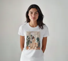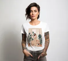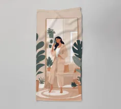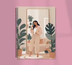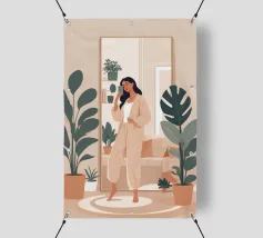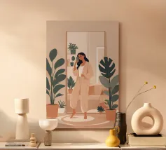 Una tranquilla illustrazione digitale di una donna in piedi davanti a un alto specchio, immersa in una luce soffusa. Il suo abbigliamento accogliente e la sua espressione serena riflettono mattinate lente e momenti di quiete. La tavolozza calda e la semplicità dell'opera d'arte la rendono perfetta per interni moderni dall'estetica tranquilla.