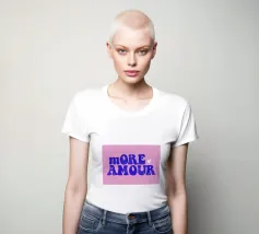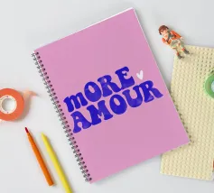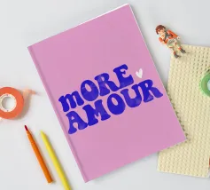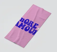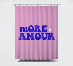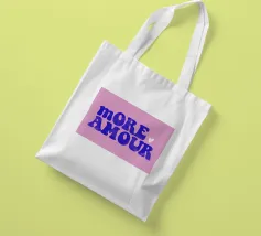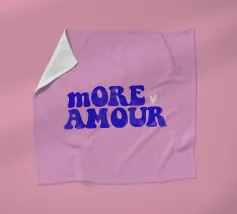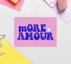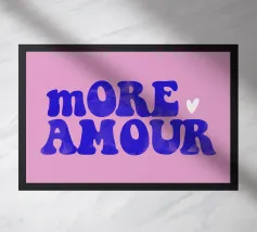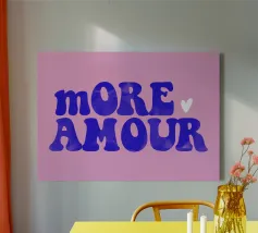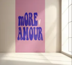 Diffondete l'amore con questo design audace e di ispirazione rétro! La scritta "More Amour" (in francese "Più amore") è in un vibrante blu su uno sfondo rosa tenue, con un dolce accento a forma di cuore. Perfetto per aggiungere un po' di fascino romantico e groovy al vostro spazio.