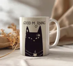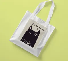 Un poster minimalista e umoristico con un gatto nero brontolone che tiene in mano una tazza di caffè fumante. La tipografia giocosa, con la "O" di "Morning" che scivola verso il basso, rende l'atmosfera mattutina sonnolenta e riluttante.