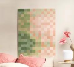 Questa composizione minimalista di quadrati di colore disposti in modo uniforme combina l'estetica digitale con la pittura contemporanea dei campi di colore. Le delicate transizioni tra i toni del verde oliva, del beige tenue e del pesca creano un'armonia ritmica. L'opera ricorda la grafica dei primi pixel e l'era della pittura a campi di colore. La precisa struttura a griglia crea un ordine meditativo, mentre la tavolozza di colori organici irradia calore. Questa fusione di precisione digitale e sensibilità pittorica si rivolge agli amanti dell'arte minimalista e agli appassionati di design.