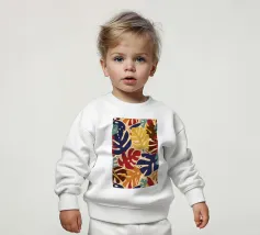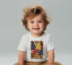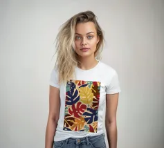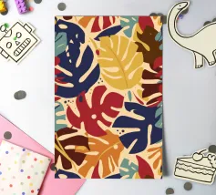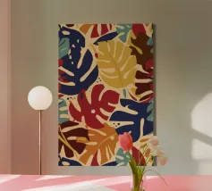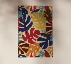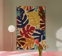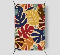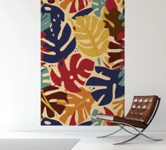 Un motivo ripetuto di monstera stilizzata e altre foglie tropicali è presentato in una tavolozza di colori retrò di giallo senape, marrone, verde acqua e ruggine, creando un mosaico botanico elegante e nostalgico.