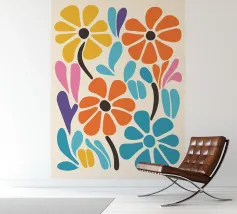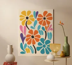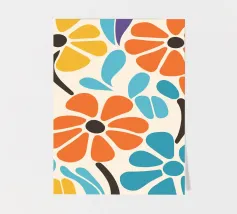 Questo colorato motivo floreale combina toni vivaci di giallo, arancione e blu con accenti giocosi di rosa e viola. Un moderno design retrò dalle linee pulite e dall'estetica minimalista che dona freschezza e gioia di vivere a qualsiasi ambiente. Ideale per murales, cuscini, tazze, cover per cellulari o tende da doccia: un vero e proprio colpo d'occhio per il soggiorno, la camera da letto o l'ufficio. Perfetto per gli amanti dell'arte di metà secolo, dei fiori boho e dello stile scandinavo. Un elemento decorativo per la vostra casa o un regalo per gli amanti dell'arte e dei fiori.
