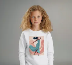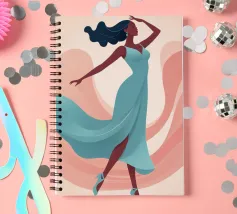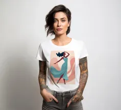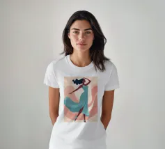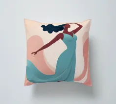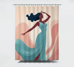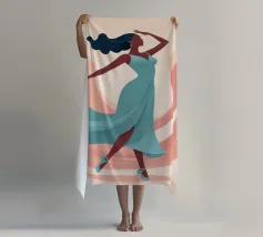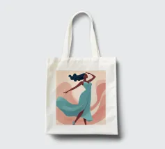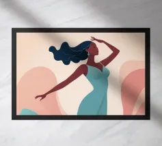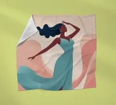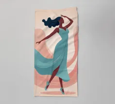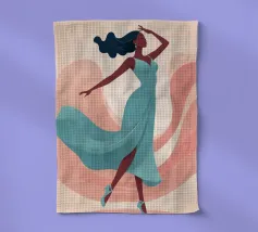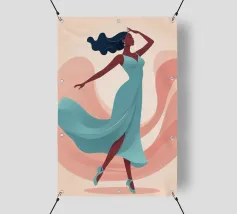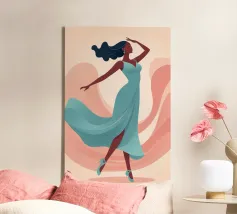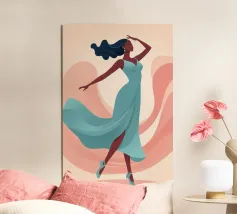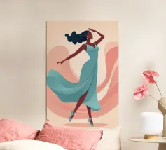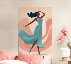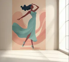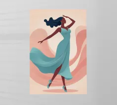 Una rappresentazione fluida e minimalista di una donna che danza con grazia in un abito verde acqua su morbide onde astratte. La postura elegante, il tessuto fluente e i toni morbidi evocano libertà ed espressione.
