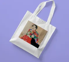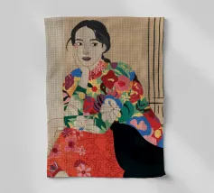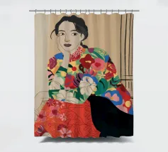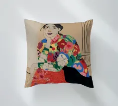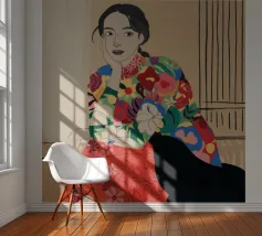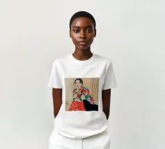 Una donna che indossa un abito floreale colorato siede con grazia, accarezzando un gatto nero, in una scena che è allo stesso tempo elegante e tenera, che celebra la moda, gli animali domestici e i momenti di tranquillità.