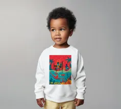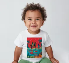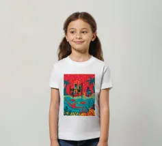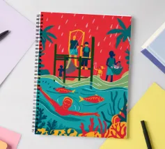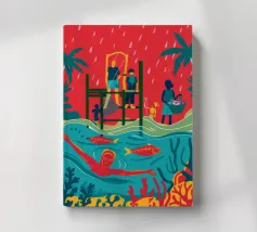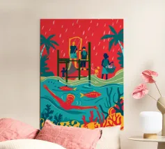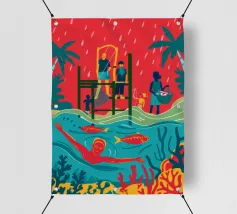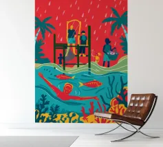 Persone in piedi su un pontile sopra l'acqua e creature marine sotto. Il contrasto tra le figure umane e la vita sottomarina aggiunge profondità e intrigo.