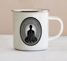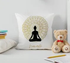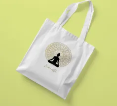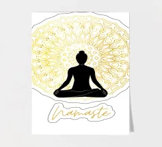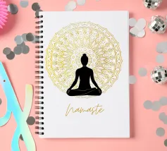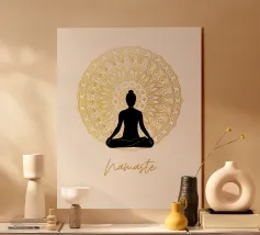 Namaste, uno dei termini yoga più conosciuti, e la sagoma di una persona che pratica yoga. Sullo sfondo un mandala dorato. Perfetto per tutti gli yogi. Ottima idea regalo per un compleanno.