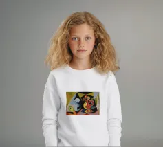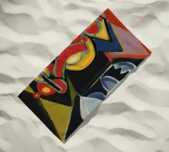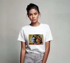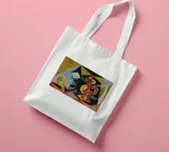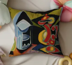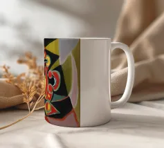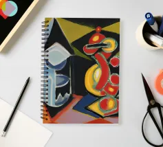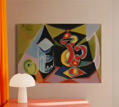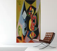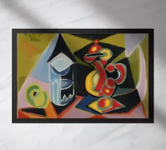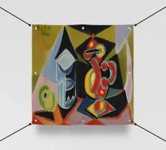 Questa vibrante e dinamica natura morta astratta presenta un energico gioco di forme geometriche e colori vivaci. La composizione è dominata da un'imponente figura in rosso e giallo, che ricorda una chitarra o uno strumento musicale stilizzato, accostata a elementi astratti in blu e bianco e a una mela verde. Lo sfondo comprende un motivo a scacchiera in nero e giallo, che aggiunge profondità e interesse visivo. Questo poster digitale di alta qualità (7000x5000 pixel, 300 dpi) cattura perfettamente la profondità intellettuale e il genio artistico del movimento cubista, rendendolo un'opera sofisticata e accattivante.