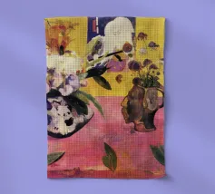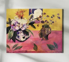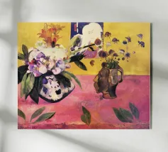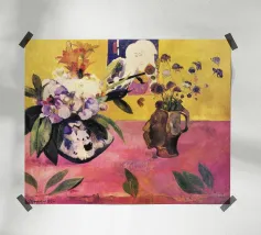 Questa sorprendente natura morta di Paul Gauguin riflette il fascino dell'artista per l'estetica non occidentale e la forma simbolica. Con un vaso scultoreo a forma di testa accanto a una xilografia giapponese e a frutta sparsa, la composizione è ricca di riferimenti interculturaliPaul Gauguin, Natura morta con vaso a forma di testa e xilografia giapponese, Postimpressionismo, Sintetismo, Simbolismo, pittura di natura morta, arte moderna del XIX secolo, arte interculturale, influenza giapponese nell'arte, natura morta di Gauguin, vaso scultoreo, giapponismo, arte e si