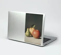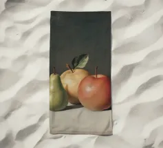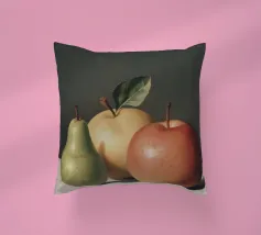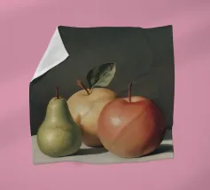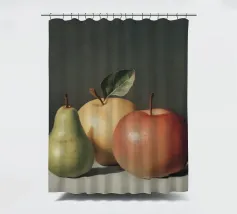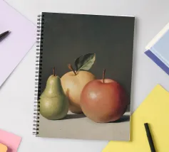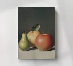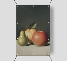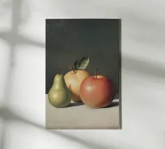 Esplorate gli intricati dettagli di una realistica natura morta con una pera verde e due mele, che mette in luce l'abilità dell'artista nel catturare la consistenza e la luce.