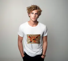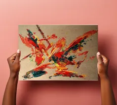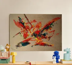 Quest'opera è realizzata su un foglio di cartone senza colorazione, lasciando visibili sullo sfondo le fibre di legno che la compongono. L'obiettivo è quello di presentare un'opera dipinta che mantenga un aspetto grezzo, offrendo un supporto che evochi la sua origine naturale. Il risultato è un'armonia e una maggiore facilità di integrazione in diversi stili di arredamento.