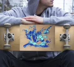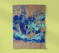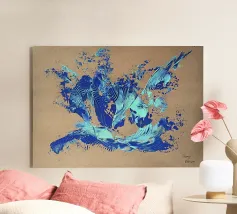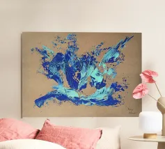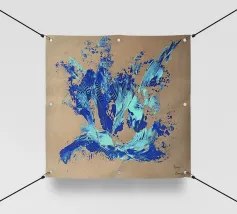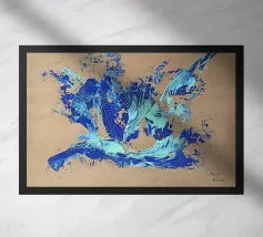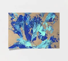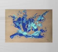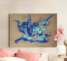 Quest'opera è realizzata su un foglio di cartone senza colorazione, lasciando visibili sullo sfondo le fibre di legno che la compongono. L'obiettivo è quello di presentare un'opera dipinta che mantenga un aspetto grezzo, offrendo un supporto che evochi la sua origine naturale. Il risultato è un'armonia e una maggiore facilità di integrazione in diversi stili di arredamento.