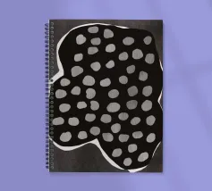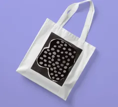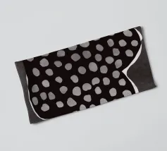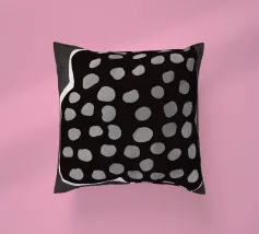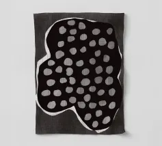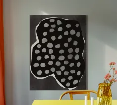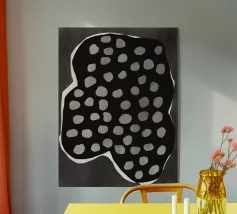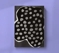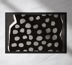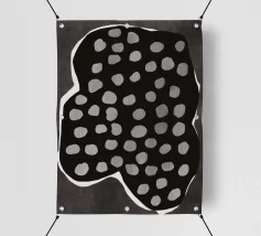 Una forma irregolare nera è riempita di punti grigi uniformemente distanziati su uno sfondo grigio scuro. Il contorno della forma è evidenziato da un bordo bianco che aggiunge contrasto alla composizione.