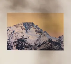 La neve bianca contrasta meravigliosamente con le rocce scure e frastagliate sottostanti, creando una scena di pura bellezza incontaminata. La luce del sole scintilla sui pendii innevati, facendo brillare l'intero paesaggio come un cristallo. I venti freddi spazzano la cima, mentre il silenzio riempie l'aria, rotto solo dallo scricchiolio della neve sotto i piedi o dal suono lontano di una valanga. È uno spettacolo mozzafiato: sereno, potente e senza tempo.