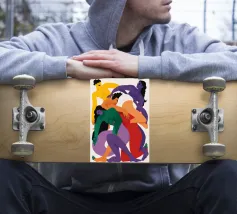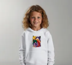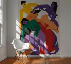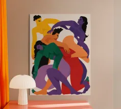 Quattro figure astratte sono intrecciate in un abbraccio amorevole e caotico, i loro corpi sono resi con colori audaci e vibranti di viola, rosso, verde e giallo, formando un nodo umano.